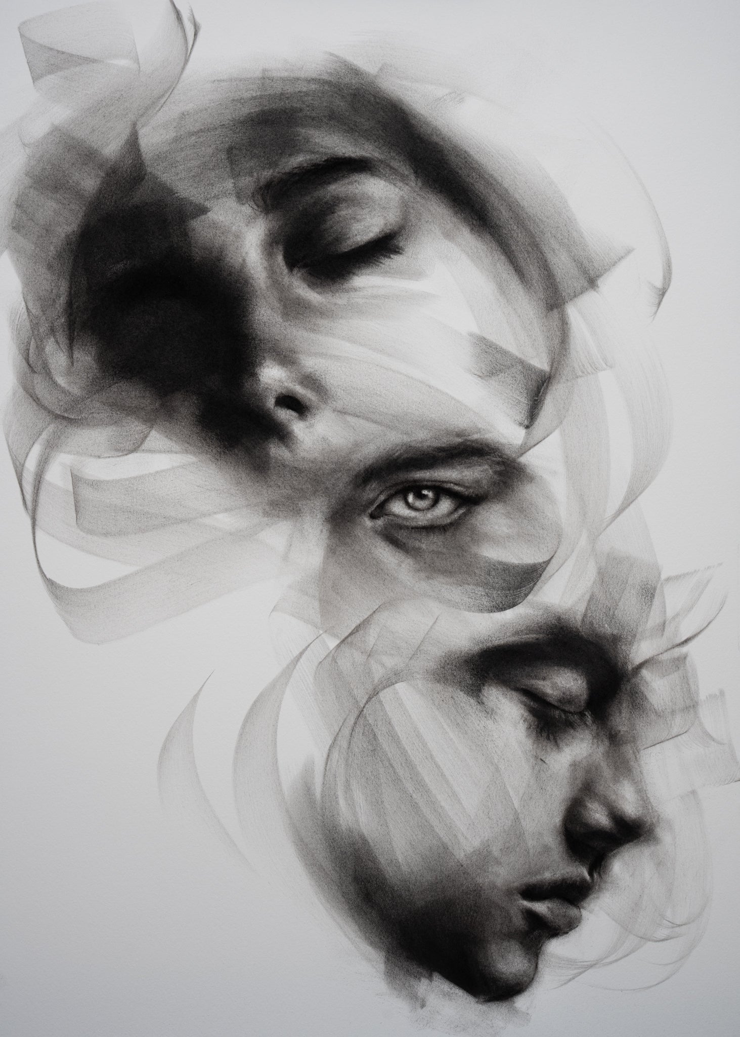 Above, a face with closed eyes, leaning slightly backward.Below, a profile resting in quiet stillness, its eyes gently shut.