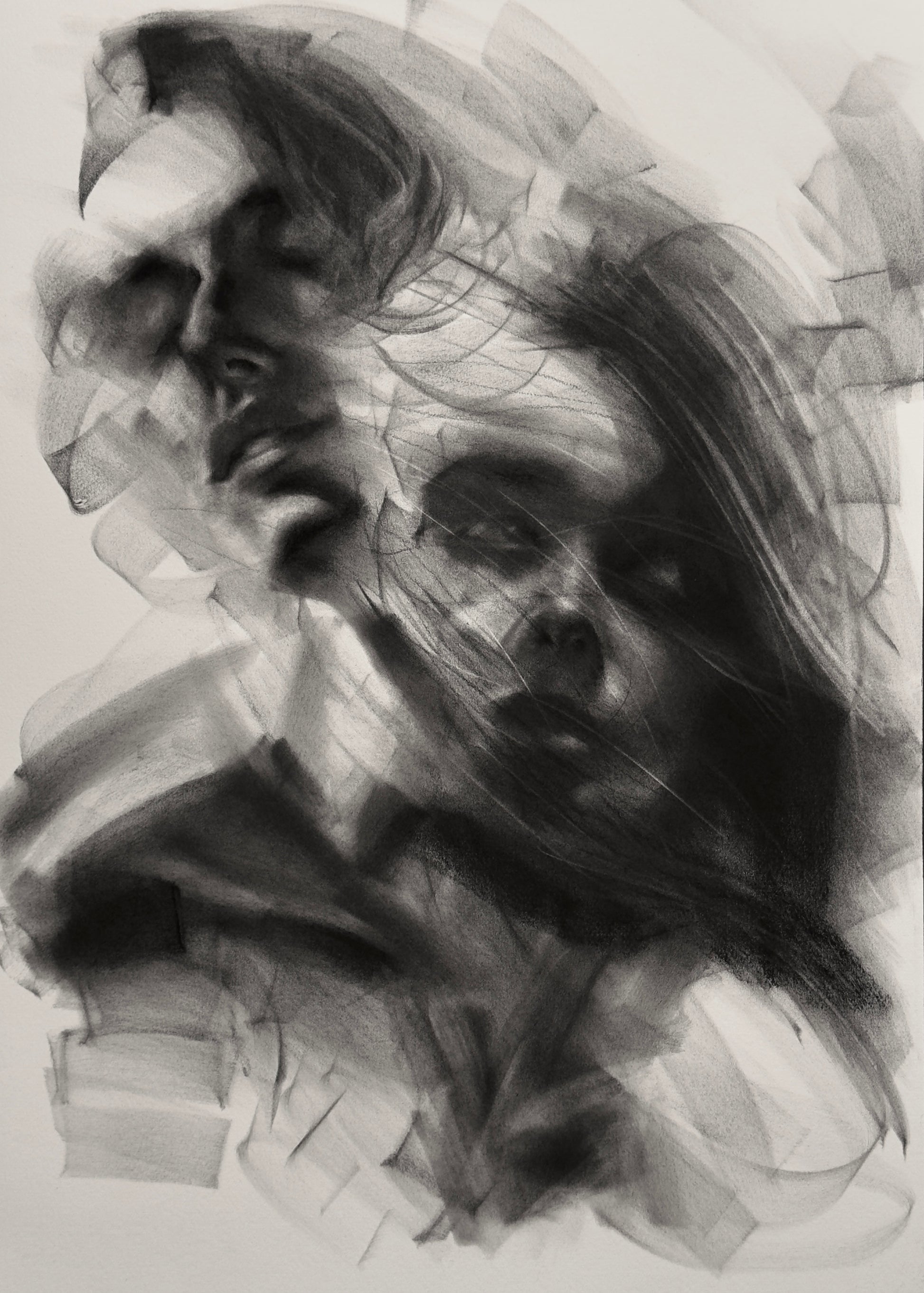 This piece portrays two faces that exist within the same body,yet are not looking at the same truth.